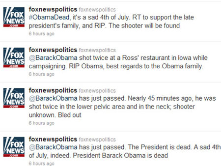 Um hacker desconhecido enviou mensagens falsas na página do Twitter da rede Fox News afirmando que o presidente Barack Obama havia morrido